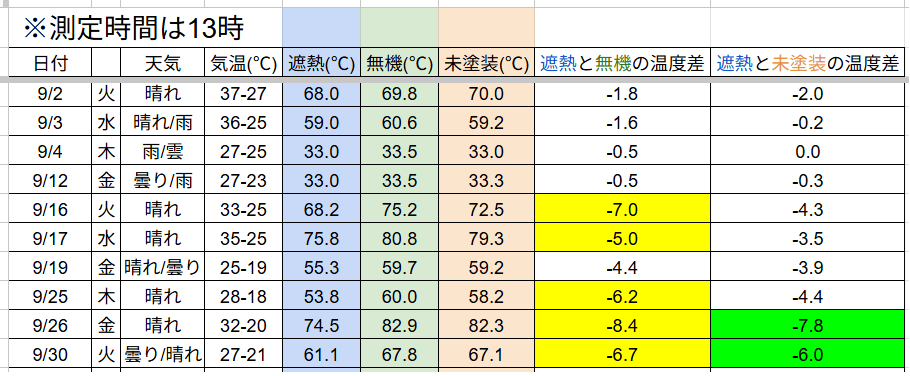 8月に続き、9月後半(9/16〜9/30)は晴天日が多く、遮熱塗料の効果がよりはっきり表れました。