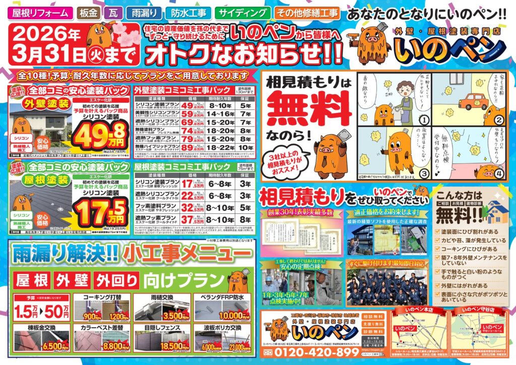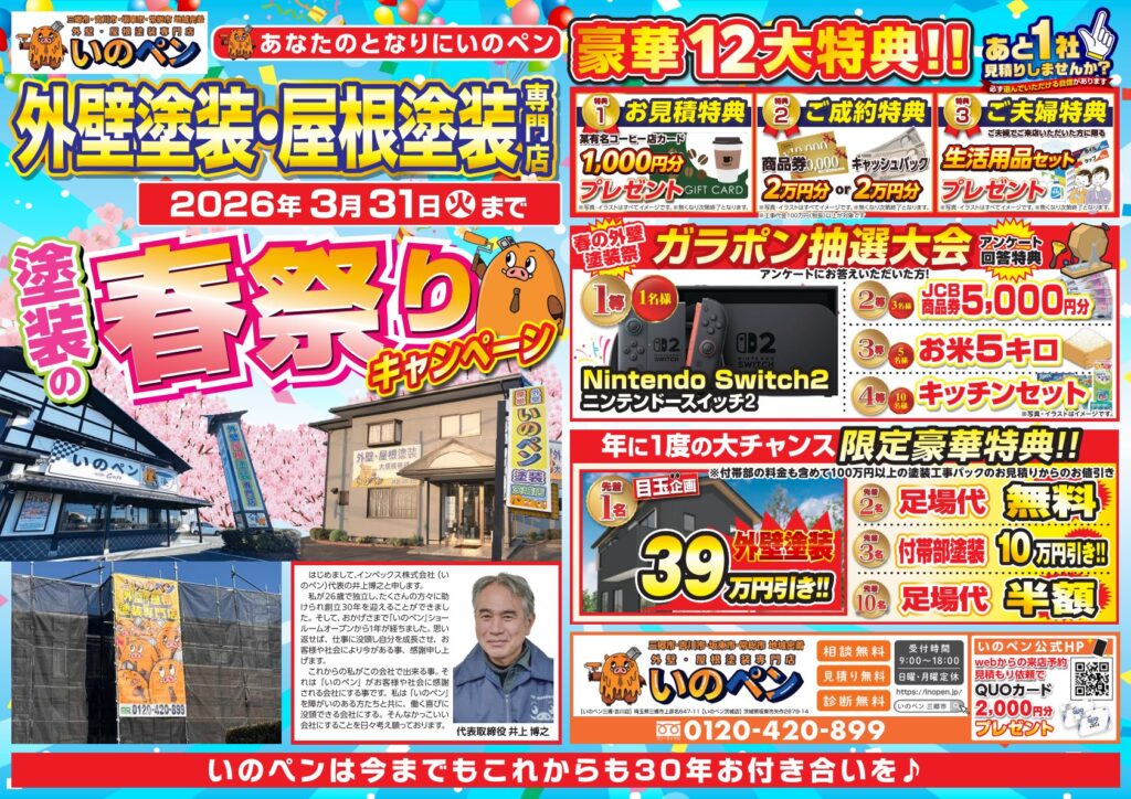 現在いのぺんでは、「塗装の春祭りキャンペーン」を開催しております!
