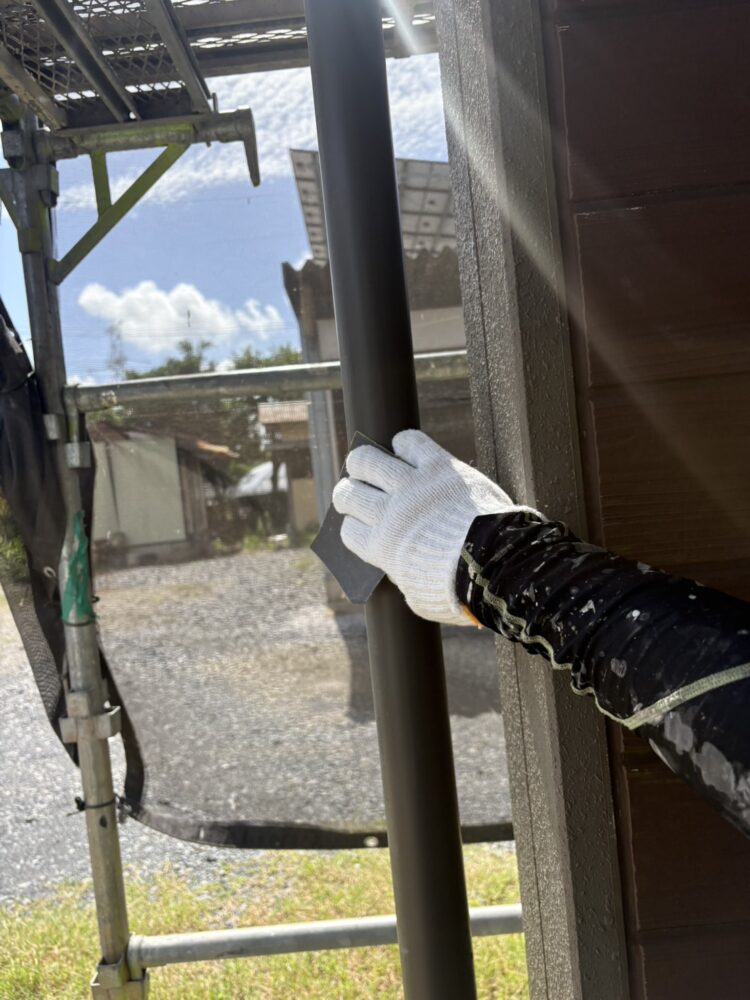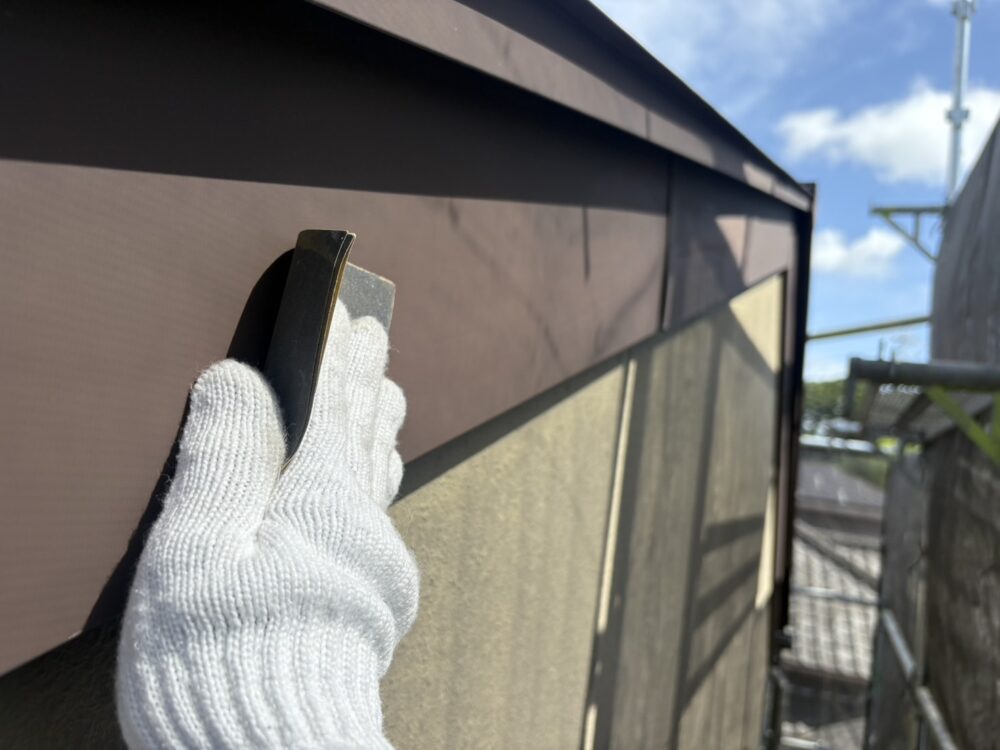 ケレン作業で古い塗膜や汚れを除去し、塗料の密着を高めます。 -