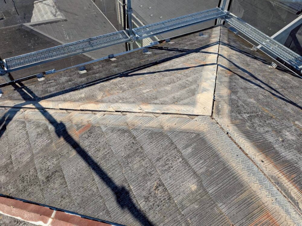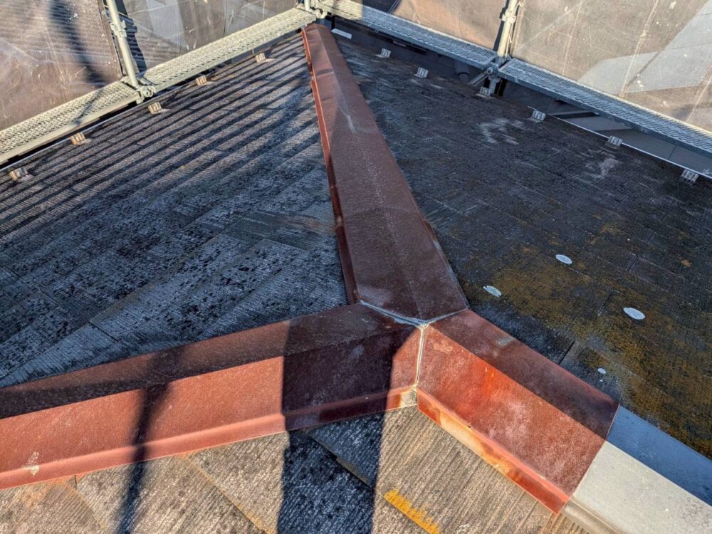 谷部や棟板金の傷み、コロニアルの劣化が進行している状態でした。 -